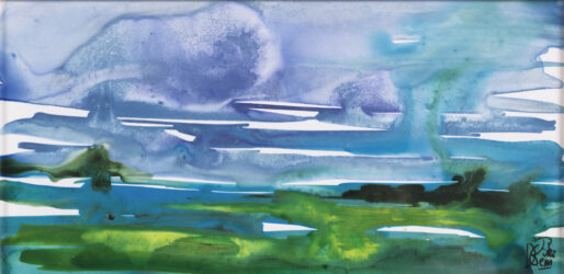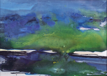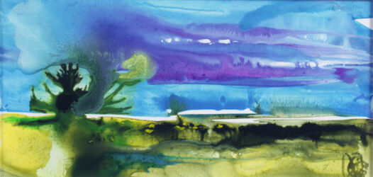 J’ai beaucoup de plaisir à jouer avec la lumière à l’état pur, dans sa puissance originelle : ciels, miroitements, embrasements. Je joue avec les contrastes éclat/douceur, force/joie. Dans cette petite œuvre, j’ai aimé travailler la transparence des couleurs, des effets de matière et des lumières, par un mélange d’aquarelles et encres. Une petite œuvre, tout en légèreté, pleine de douceur, et de joie ; j’ai envie que mes peintures donnent envie, aux personnes qui les regardent, de plonger dans la paix, la beauté de la nature et de notre planète et trouvent une sorte de ressource de douceur et de force naturelles, pour ce que nous devons faire : sauver le monde.
