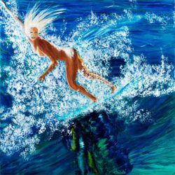Je veux traduire la vitalité, l’exubérance par le mouvement, une surfeuse en pleine action sur la lèvre de la vague, ou dans la paix, l’infini …. , la profondeur de la Vie, …une sorte de féminité indépendante, joyeuse, recueillie, ou concentrée. Faire de la femme ancestrale une surfeuse moderne, toute la pulsion de vie concentrée dans un corps détendu, et mobilisé dans l’action pacifique, jouissive…..pour son propre plaisir.