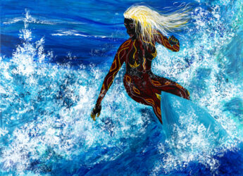 I chose to paint tattoos on the whole body that evoke Aboriginal art, to remind us that women have been around since the beginning of time too…, in this rather masculine world… and thus create an abyss in time between this ancestral woman and the modernity of the surfer…