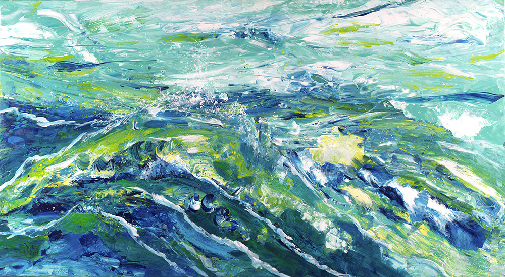 I like to play between the figurative and the abstract … it is not a question of a pure abstraction but rather of an interpretation of the real, an abstraction which arises from an emotion … to show, to make feel the power of the ocean, its beauty … the changing colors, a ray or a sunset, reflections in the water … everything is a pretext for this subtle game, with a search for different material effects, conducive to suggesting this life drive of Nature, a recurring theme in my work.